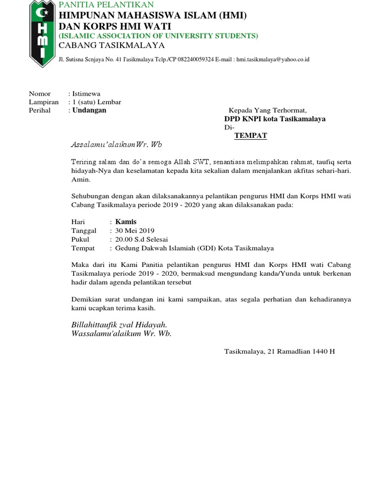 . Dalam membuat surat. Unduh sebagai doc pdf txt atau baca online dari scribd. Sehubungan akan diadakannya pelantikan pengurus hmi komisariat stai muttaqien purwakarta periode 2015 2016 maka dengan ini kami selaku panitia mengundang yunda dan ayunda untuk menghadiri demi.